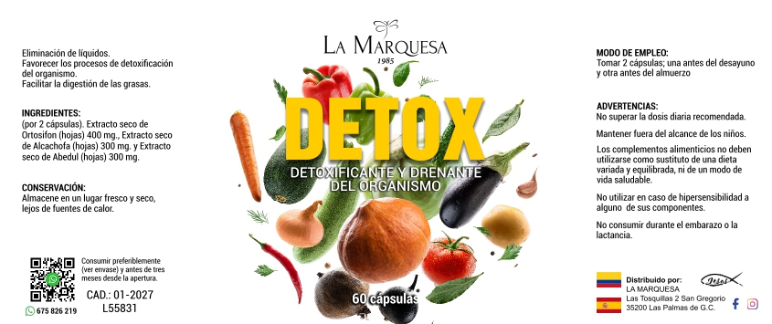 Detox de La Marquesa es un complemento alimenticio diseñado para favorecer los procesos de desintoxicación del organismo, la eliminación de líquidos y el apoyo digestivo.